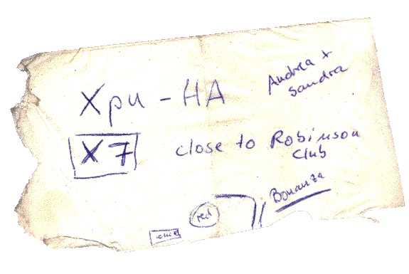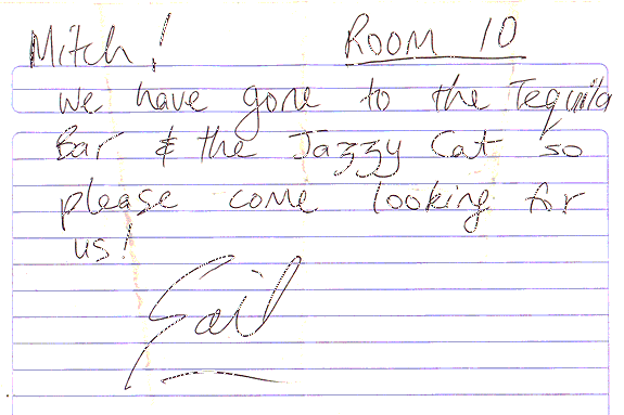 Terug in het hotel vind ik een briefje van Gail. De groep zit in de stad op me te wachten. In de Tequila Bar zijn ze niet, de andere bar kan ik niet meteen vinden. Ik loop rond en moet een paar keer vragen waar het is. Het kost me méér moeite om mijn eigen groep te vinden, dan het vanochtend kostte om Andrea te vinden! Grappig...
